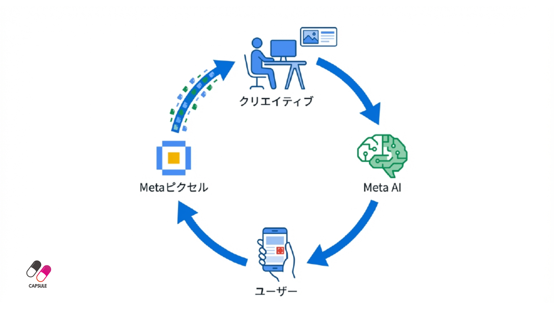 「Advantage+」などの自動化機能を活用することで、運用者の経験値に依存せず、安定した成果を出せるようになってきています。ただし、AIに正しく学習させるためには、適切な「初期設定」と「クリエイティブの投入」が不可欠です。完全に放置してよいわけではなく、AIという優秀なドライバーに、正しい目的地とガソリン(クリエイティブ)を与えるのが私たちの役割だと言えます。