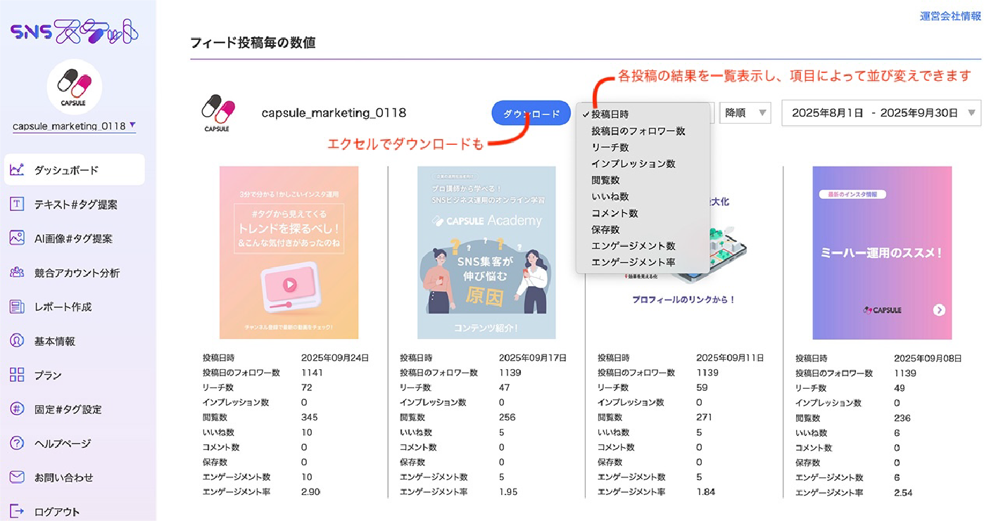 データレポート出力機能期間を指定し、1クリックで見やすいレポートが出力可能。投稿結果を数値化して残すことで効果的な運用につながります。